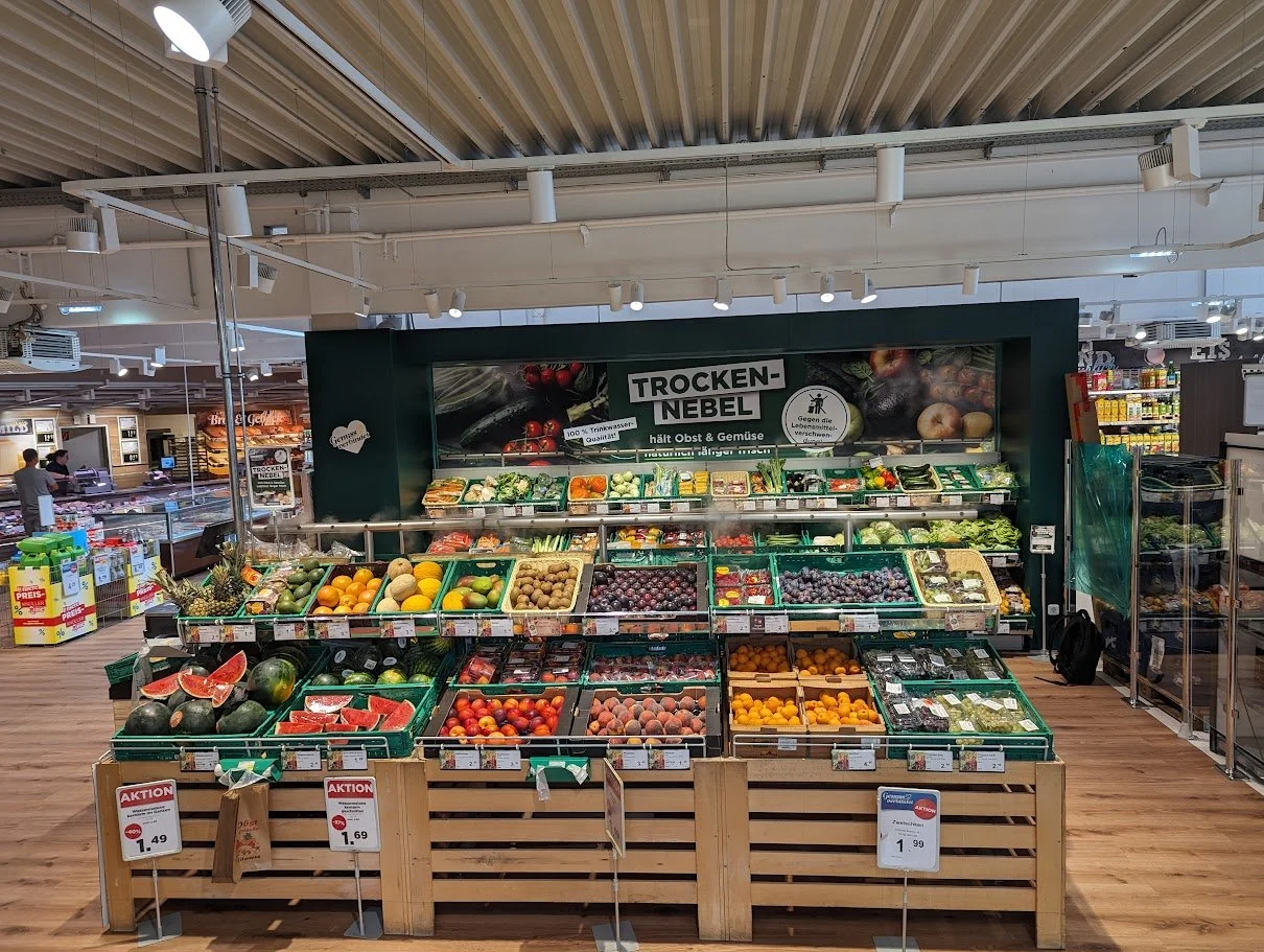 Hier kommt die Trockenbenebelungstechnik zum Einsatz. Dabei handelt es sich um lokale und effiziente Trockenbenebelungs-Systeme, die Lebensmittel durch feinsten Nebel aus speziell gefiltertem Wasser ideal befeuchten. Das Wasser kommt dabei ohne jegliche Zusätze aus und die Hygiene wird durch laufende Überwachung der Wasserqualität sichergestellt.